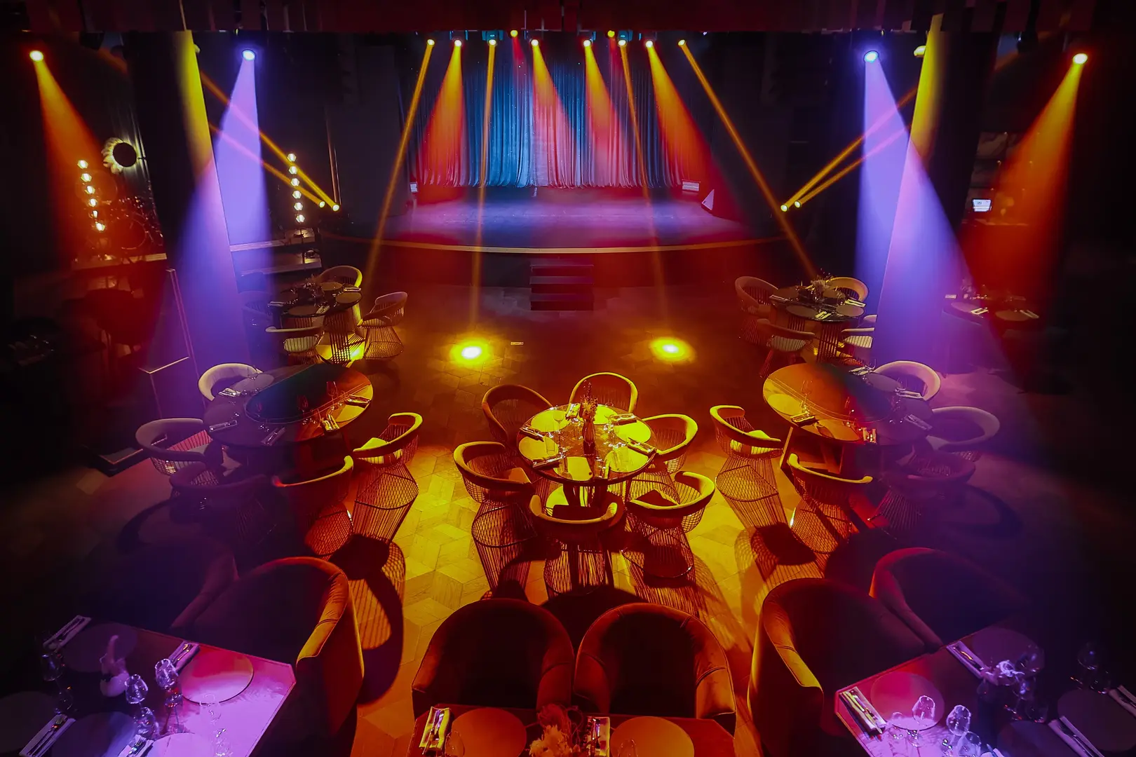 Длинная стойка контактного бара, возможность курить кальяны, наличие лебёдок для подвесов и 3 гримерных комнаты.